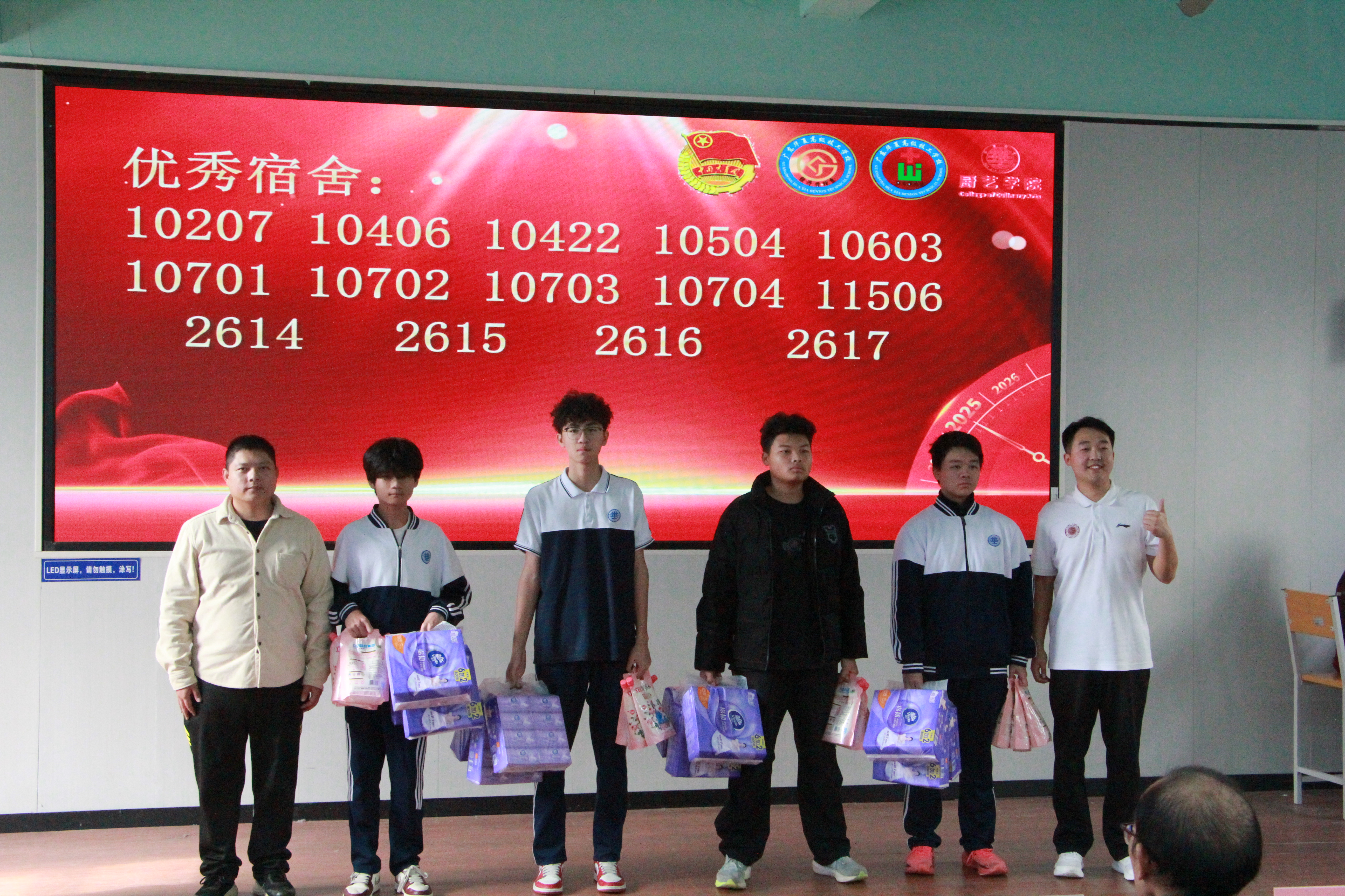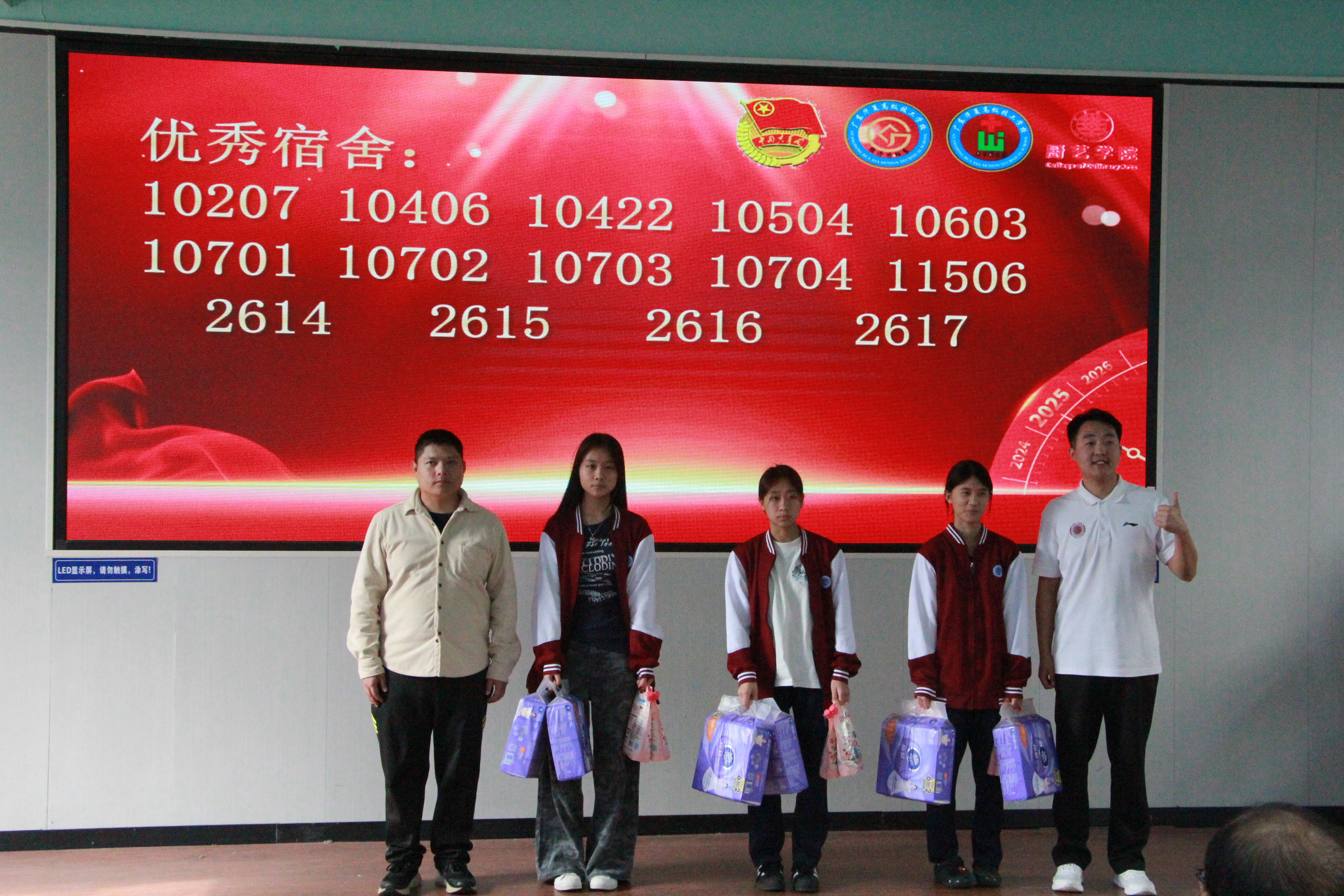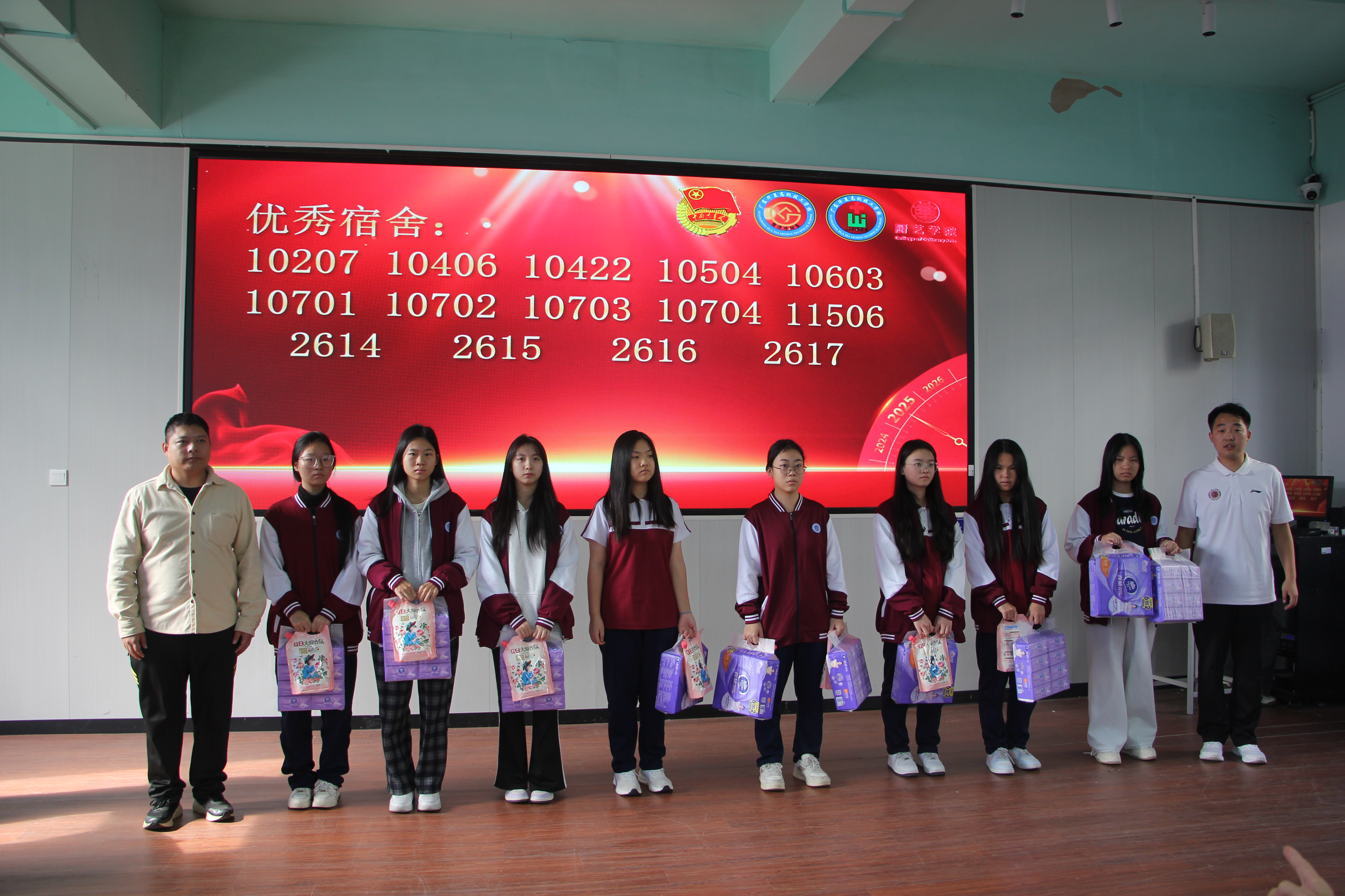 随后进入表彰环节,大会对本学期宿舍文化节中涌现的优秀宿舍及表现突出的团学成员进行表彰。在宿舍文化节评选中,10207、10406、10422等14个宿舍凭借整洁的内务环境、浓厚的文化氛围、和谐的宿舍氛围获评“优秀宿舍”